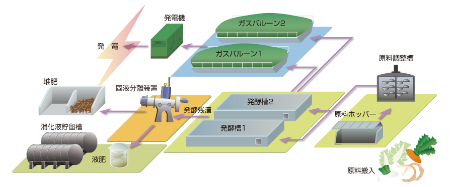 エポジェネ苫小牧バイオガス施設では食品廃棄物をメタン発酵の原料とし、再生可能エネルギーであるメタンガスを生成します。生成されたメタンガスは発電機に供給され電力となります。